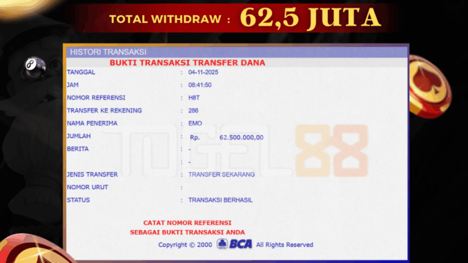 TOGEL88 mengucapkan selamat kepada user id : EMO*** yang telah berhasil mendapatkan jackpot pada permainan LIVE CASINO DI OGLOK. Kemenangan sebesar Rp 62.500.000,-. telah dibayarkan LUNAS oleh pihak TOGEL88 kepada pemilik user id setelah yang bersangkutan mengisi formulir withdraw. Proses pencairan dana berlangsung sangat cepat hanya dalam waktu 5-10 menit sudah berada dalam rekening pemilik user id. Bukti transfer yang dapat anda lihat adalah bukti SAH / VALID yang langsung di dapatkan melalui bukti transaksi dari Bank yang digunakan untuk pengiriman dana pada rekening pemilik user id. Terima kasih kami sampaikan kepada para pengguna setia TOGEL88 yang telah menggunakan situs kami, sebagai Bandar Terpercaya yang pastinya membayar semua kemenangan member hingga lunas. Apakah TOGEL88 PENIPU ? Reputasi “TOGEL88 TERPERCAYA” sudah sangat melekat. puluhan hingga ratusan ribu pengguna setia TOGEL88 tetap menggunakan situs terbesar dan terbaik di Indonesia ini. Hapus rasa was-was dan khawatir anda, kemenangan anda berapapun PASTI dibayarkan hingga lunas.