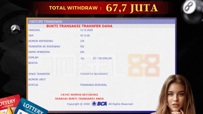 TOGEL88 mengucapkan selamat kepada user id : PAO*** yang telah berhasil mendapatkan jackpot pada permainan TOGEL DI SINGAPORE POOLS. Kemenangan sebesar Rp 67.700.000,-. telah dibayarkan LUNAS oleh pihak TOGEL88 kepada pemilik user id setelah yang bersangkutan mengisi formulir withdraw. Proses pencairan dana berlangsung sangat cepat hanya dalam waktu 5-10 menit sudah berada dalam rekening pemilik user id. Bukti transfer yang dapat anda lihat adalah bukti SAH / VALID yang langsung di dapatkan melalui bukti transaksi dari Bank yang digunakan untuk pengiriman dana pada rekening pemilik user id. Terima kasih kami sampaikan kepada para pengguna setia TOGEL88 yang telah menggunakan situs kami, sebagai Bandar Terpercaya yang pastinya membayar semua kemenangan member hingga lunas. Apakah TOGEL88 PENIPU ? Reputasi “TOGEL88 TERPERCAYA” sudah sangat melekat. puluhan hingga ratusan ribu pengguna setia TOGEL88 tetap menggunakan situs terbesar dan terbaik di Indonesia ini. Hapus rasa was-was dan khawatir anda, kemenangan anda berapapun PASTI dibayarkan hingga lunas.