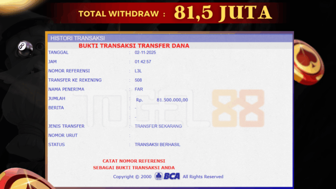 TOGEL88 mengucapkan selamat kepada user id : OWE*** yang telah berhasil mendapatkan jackpot pada permainan LIVE CASINO DI ROULETTE. Kemenangan sebesar Rp 81.500.000,-. telah dibayarkan LUNAS oleh pihak TOGEL88 kepada pemilik user id setelah yang bersangkutan mengisi formulir withdraw. Proses pencairan dana berlangsung sangat cepat hanya dalam waktu 5-10 menit sudah berada dalam rekening pemilik user id. Bukti transfer yang dapat anda lihat adalah bukti SAH / VALID yang langsung di dapatkan melalui bukti transaksi dari Bank yang digunakan untuk pengiriman dana pada rekening pemilik user id. Terima kasih kami sampaikan kepada para pengguna setia TOGEL88 yang telah menggunakan situs kami, sebagai Bandar Terpercaya yang pastinya membayar semua kemenangan member hingga lunas. Apakah TOGEL88 PENIPU ? Reputasi “TOGEL88 TERPERCAYA” sudah sangat melekat. puluhan hingga ratusan ribu pengguna setia TOGEL88 tetap menggunakan situs terbesar dan terbaik di Indonesia ini. Hapus rasa was-was dan khawatir anda, kemenangan anda berapapun PASTI dibayarkan hingga lunas.
