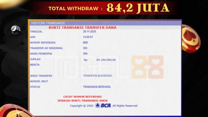 TOGEL88 mengucapkan selamat kepada user id : VIN*** yang telah berhasil mendapatkan jackpot pada permainan LIVE CASINO DI ROULETTE . Kemenangan sebesar Rp 84.250.000,-. telah dibayarkan LUNAS oleh pihak TOGEL88 kepada pemilik user id setelah yang bersangkutan mengisi formulir withdraw. Proses pencairan dana berlangsung sangat cepat hanya dalam waktu 5-10 menit sudah berada dalam rekening pemilik user id. Bukti transfer yang dapat anda lihat adalah bukti SAH / VALID yang langsung di dapatkan melalui bukti transaksi dari Bank yang digunakan untuk pengiriman dana pada rekening pemilik user id. Terima kasih kami sampaikan kepada para pengguna setia TOGEL88 yang telah menggunakan situs kami, sebagai Bandar Terpercaya yang pastinya membayar semua kemenangan member hingga lunas. Apakah TOGEL88 PENIPU ? Reputasi “TOGEL88 TERPERCAYA” sudah sangat melekat. puluhan hingga ratusan ribu pengguna setia TOGEL88 tetap menggunakan situs terbesar dan terbaik di Indonesia ini. Hapus rasa was-was dan khawatir anda, kemenangan anda berapapun PASTI dibayarkan hingga lunas.