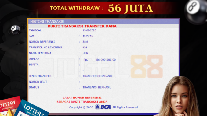 TOGEL88 mengucapkan selamat kepada user id : HER*** yang telah berhasil mendapatkan jackpot pada permainan TOGEL DI 12 ZODIAC TOTO (PISCES). Kemenangan sebesar Rp 56.000.000,-. telah dibayarkan LUNAS oleh pihak TOGEL88 kepada pemilik user id setelah yang bersangkutan mengisi formulir withdraw. Proses pencairan dana berlangsung sangat cepat hanya dalam waktu 5-10 menit sudah berada dalam rekening pemilik user id. Bukti transfer yang dapat anda lihat adalah bukti SAH / VALID yang langsung di dapatkan melalui bukti transaksi dari Bank yang digunakan untuk pengiriman dana pada rekening pemilik user id. Terima kasih kami sampaikan kepada para pengguna setia TOGEL88 yang telah menggunakan situs kami, sebagai Bandar Terpercaya yang pastinya membayar semua kemenangan member hingga lunas. Apakah TOGEL88 PENIPU ? Reputasi “TOGEL88 TERPERCAYA” sudah sangat melekat. puluhan hingga ratusan ribu pengguna setia TOGEL88 tetap menggunakan situs terbesar dan terbaik di Indonesia ini. Hapus rasa was-was dan khawatir anda, kemenangan anda berapapun PASTI dibayarkan hingga lunas.
