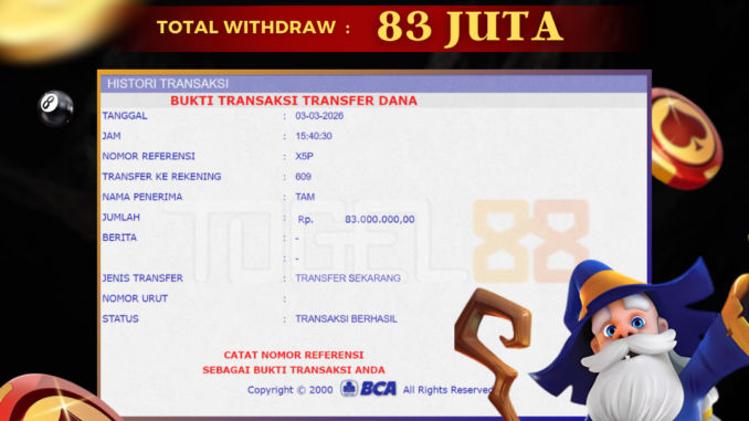TOGEL88 mengucapkan selamat kepada user id : RIN*** yang telah berhasil mendapatkan jackpot pada permainan LIVE CASINO DI DRAGON TIGER. Kemenangan sebesar Rp 83.000.000,-. telah dibayarkan LUNAS oleh pihak TOGEL88 kepada pemilik user id setelah yang bersangkutan mengisi formulir withdraw. Proses pencairan dana berlangsung sangat cepat hanya dalam waktu 5-10 menit sudah berada dalam rekening pemilik user id. Bukti transfer yang dapat anda lihat adalah bukti SAH / VALID yang langsung di dapatkan melalui bukti transaksi dari Bank yang digunakan untuk pengiriman dana pada rekening pemilik user id. Terima kasih kami sampaikan kepada para pengguna setia TOGEL88 yang telah menggunakan situs kami, sebagai Bandar Terpercaya yang pastinya membayar semua kemenangan member hingga lunas. Apakah TOGEL88 PENIPU ? Reputasi “TOGEL88 TERPERCAYA” sudah sangat melekat. puluhan hingga ratusan ribu pengguna setia TOGEL88 tetap menggunakan situs terbesar dan terbaik di Indonesia ini. Hapus rasa was-was dan khawatir anda, kemenangan anda berapapun PASTI dibayarkan hingga lunas.